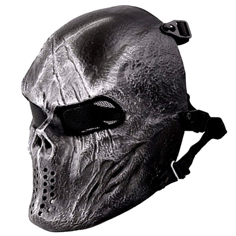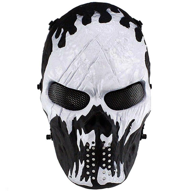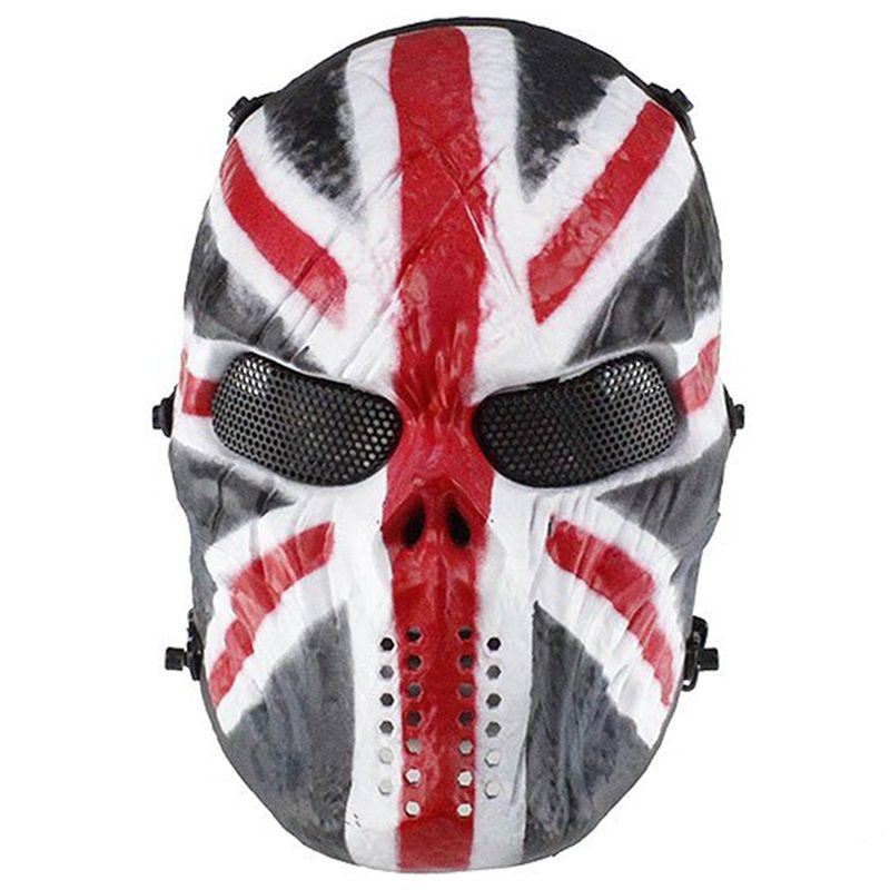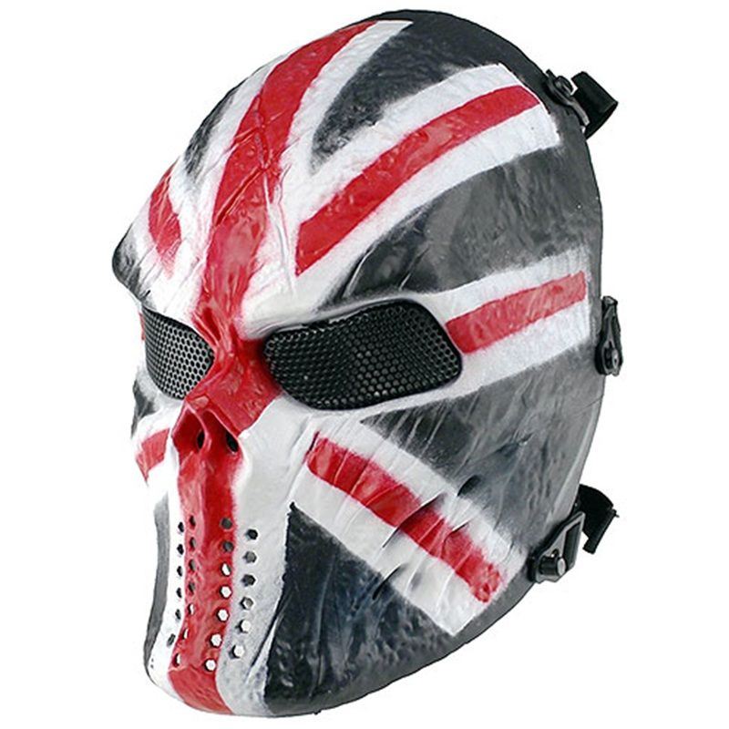Comments: Play it to the bone with this tactical full face mask. It features an impact resistant plastic shell and mesh steel eye holes. The bungee headband is connected with quick-release anchors. Available with black & white, union jack, or silver grey pattern for style and camouflage.