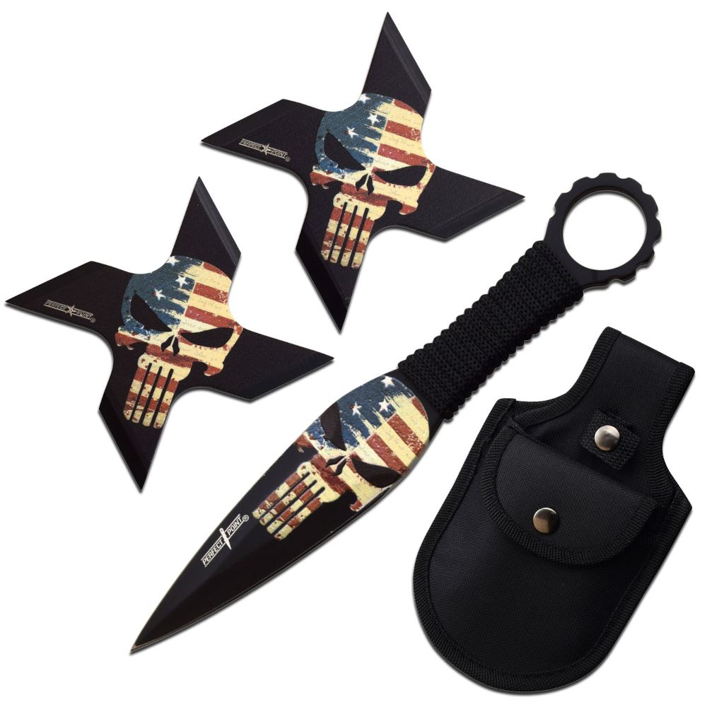 The set comes with a nylon sheath for convenient storage and transport. Whether you're practicing your throwing skills or simply admiring the patriotic design, the American Skull Set is a must-have for any throwing blade enthusiast.