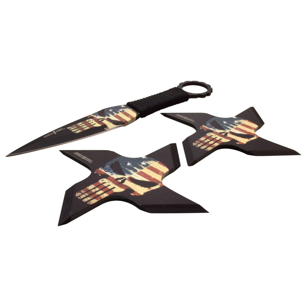 Introducing the American Skull Set, a patriotic-themed throwing knife and 2 throwing stars set designed for target sports enthusiasts. This set features a 6.5" throwing knife and two 4" throwing stars, all adorned with vibrant flag artwork.