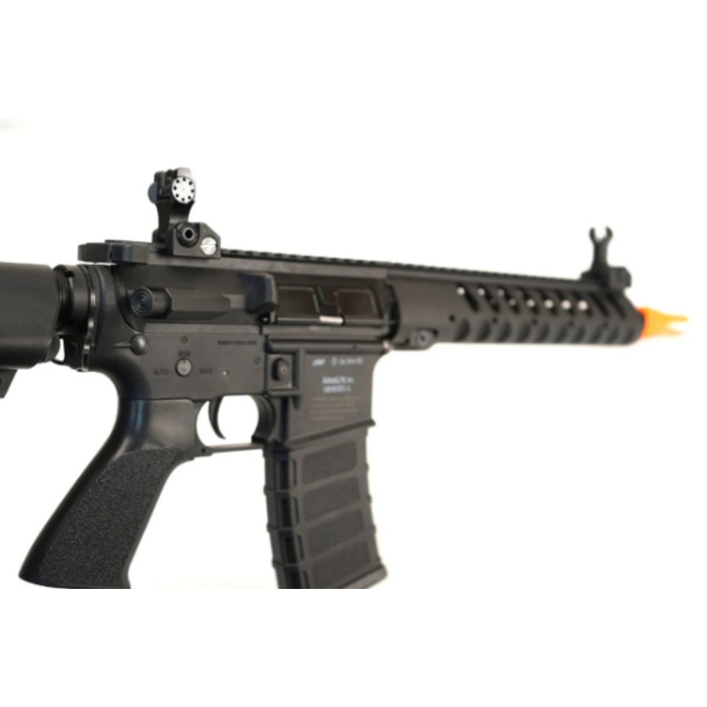 This AEG features a metal alloy outer barrel, lower hand guard section, buffer tube, sling plate and internals married to a sturdy polymer receiver, pistol grip, stock and upper hand guard. This Light Tactical Carbine features an adjustable Hop-Up unit, a pre fitted MOSFET trigger system and a unique Diamondhead VRS style handguard - which features modular side rail panels for attaching torches and lasers. In addition, there is a lower KeyMod Rail length for attaching KeyMod Grips and Bipods. The top of the weapon features a long 20mm RIS / RAS accessory rail allowing the attachment of a range of sights and scopes. As part of the SLV package this model comes with a high capacity magazine. This model has been fabricated to fire on only semi-automatic mode to comply with the airsoft restrictions of several countries.