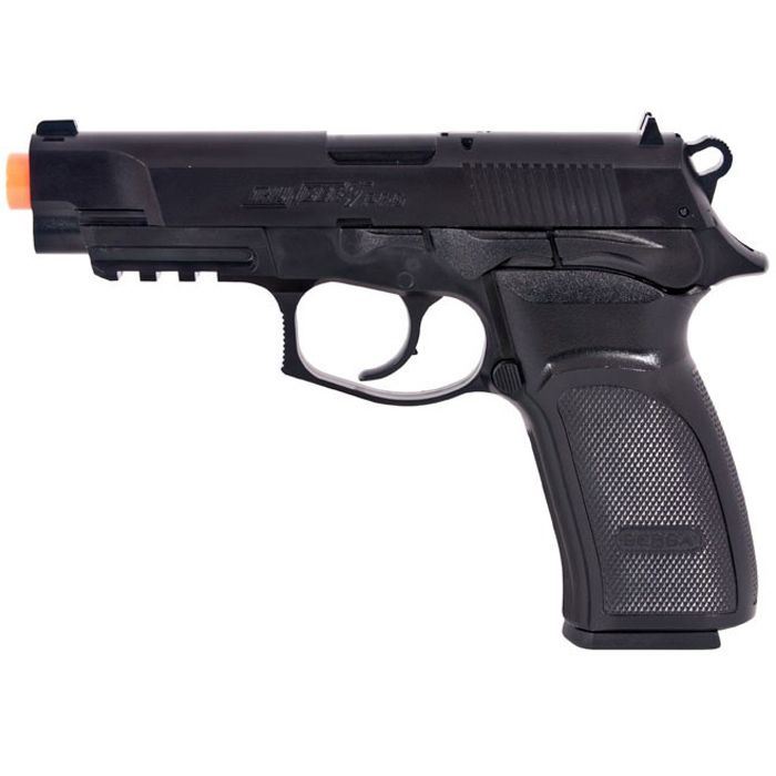 Comments: Sleek and compact, the BERSA Thunder 9 Pro Airsoft Pistol is designed to pack a punch on the airsoft field. The full-size airgun comes with authentic BERSA markings and an integrated lower picatinny rail. The barrel is threaded for a silencer, while the non-blowback design gets more shots per CO2. The ergonomic grip is designed for comfortable handling and improved control. Expect high-FPS shots and decisive power from this semi-automatic pistol.