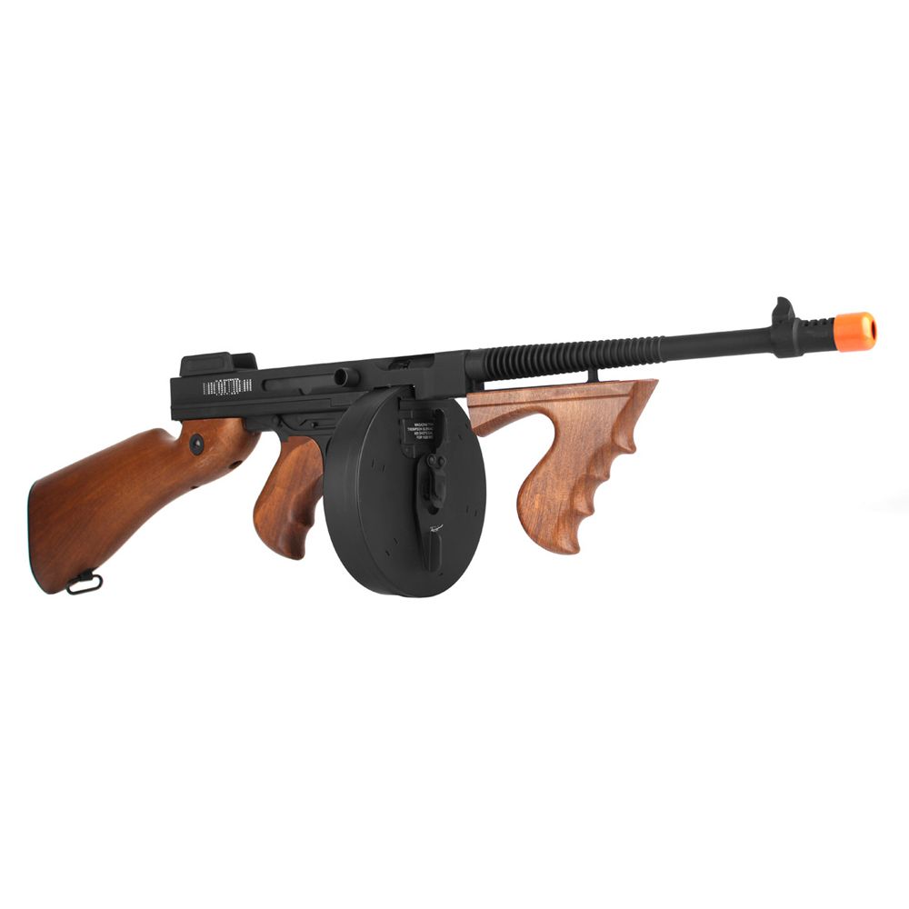 Comments: Mow down your opponents on the airsoft field with this Cybergun licensed Chicago Typewriter! This realistic replica is laser engraved with official Thompson M1A1 trademarks. This SMG has serious style, with its faux wood furniture and unique ribbed outer barrel. It has an adjustable hop-up and rear sight, allowing you to dial in your aim.