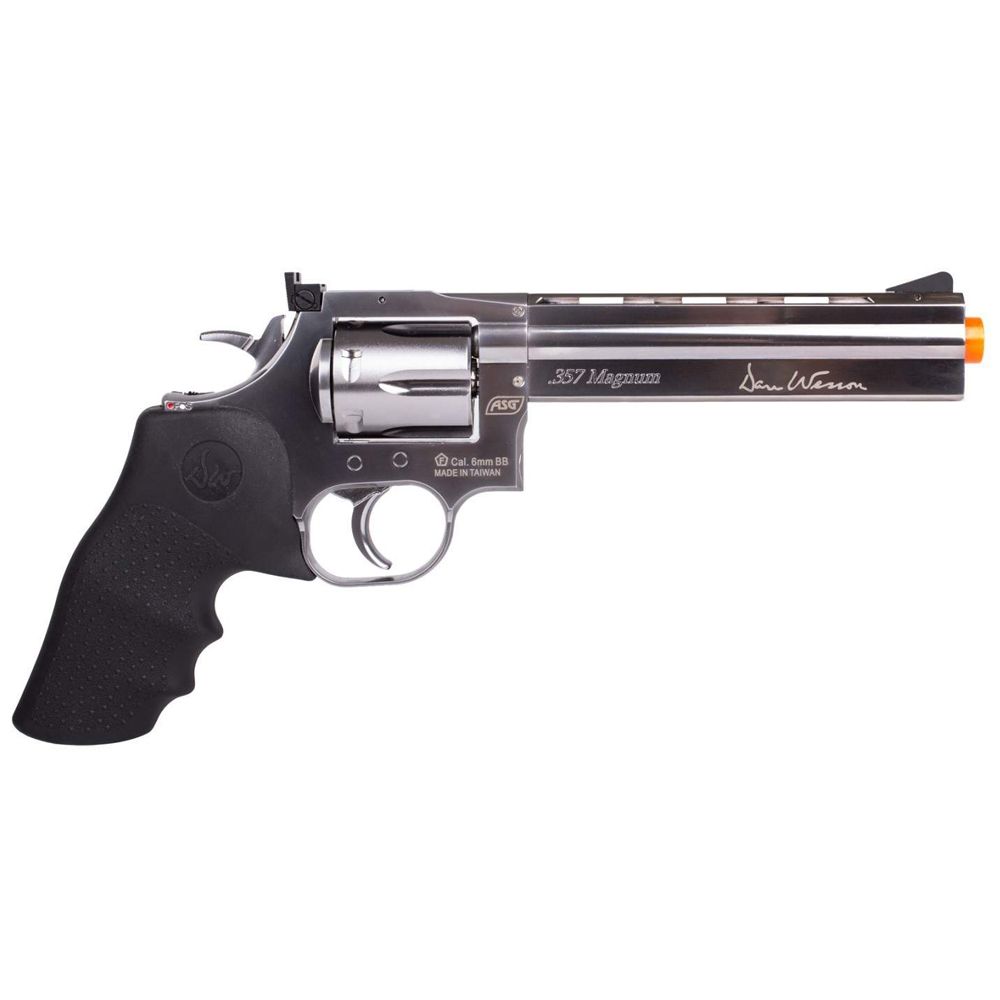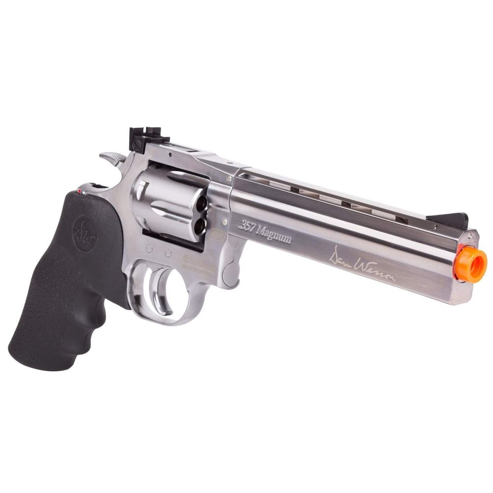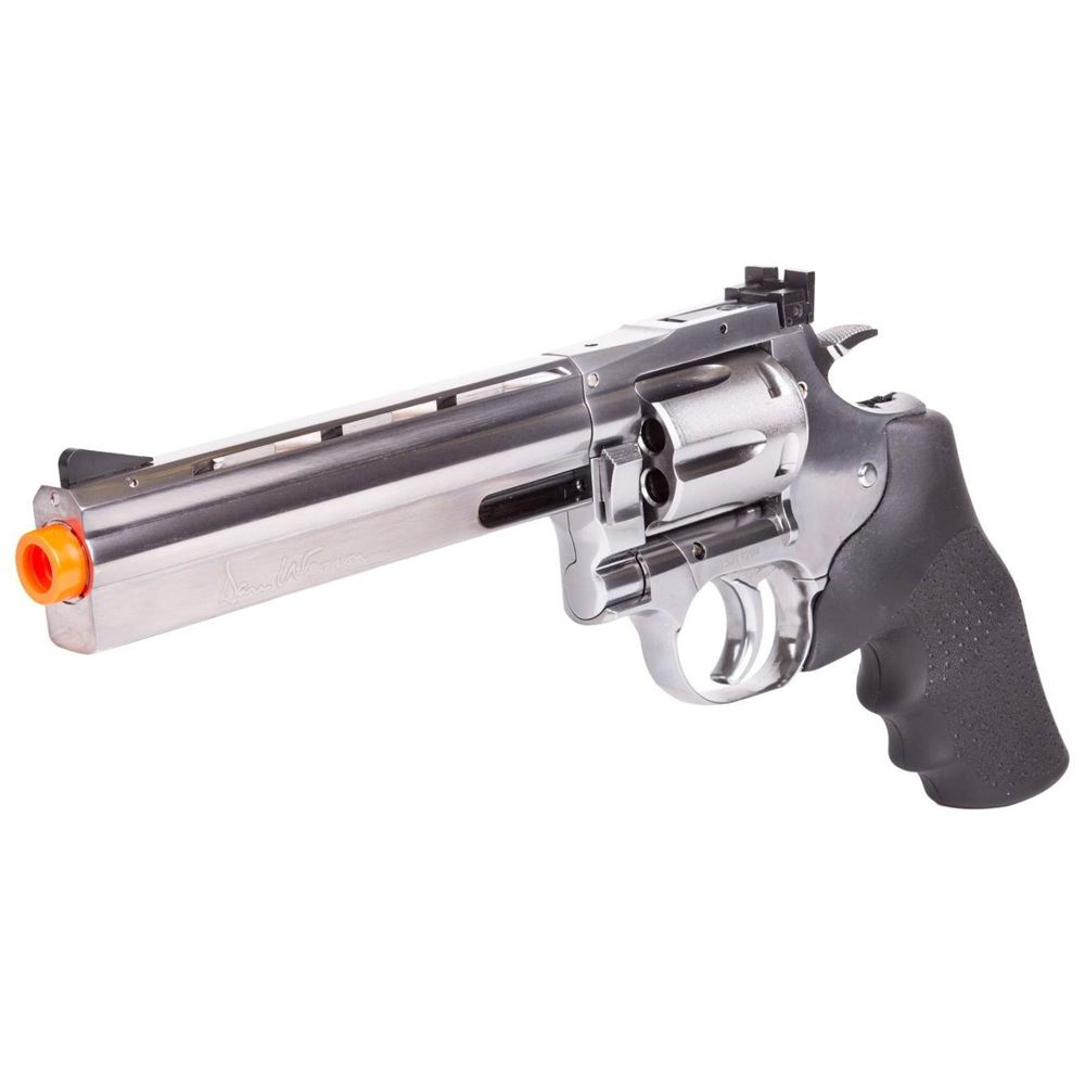Comments: The Dan Wesson 715 CO2 Airsoft Revolver lives up to the legendary Dan Wesson name, combining power and accuracy into a sleek, all metal design. The 6-round revolver features an adjustable hop-up system, vent rib with threading for mounting accessories, and a Hogue imitation rubber grip. A recommended revolver to use for long range target shooting and airsoft skirmishes. Orange tip required on US version.