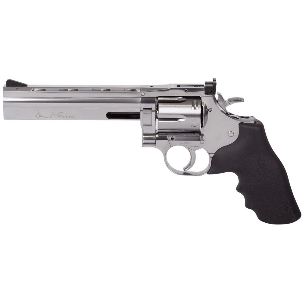 Comments: Precision and craftsmanship represent the Dan Wesson name unlike no other with the silver 715 Steel BB Revolver. The replica Hogue grip provides a textured rubber handle that lets you easily balance the heavy gun. A tactical rail can be attached to the 6 inch barrel on its ribbed vents, making it easy to mount accessories.