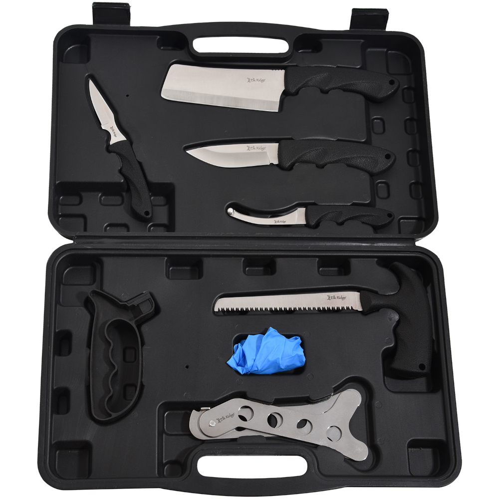 The kit is reliable and delivers consistently sharp cutting performance and lasting durability, making it an essential companion for camping, hiking, hunting, fishing, and more. The set includes a 12.5-inch butcher knife, 12-inch saw, 10-inch boning knife, 9-inch gut hook knife, and 8.5-inch caper knife, all with black nylon fiber handles. Additional accessories include a sharpening rod, shears, cutting board, and an injection-molded hard-sided carrying/storage case for convenience and portability.