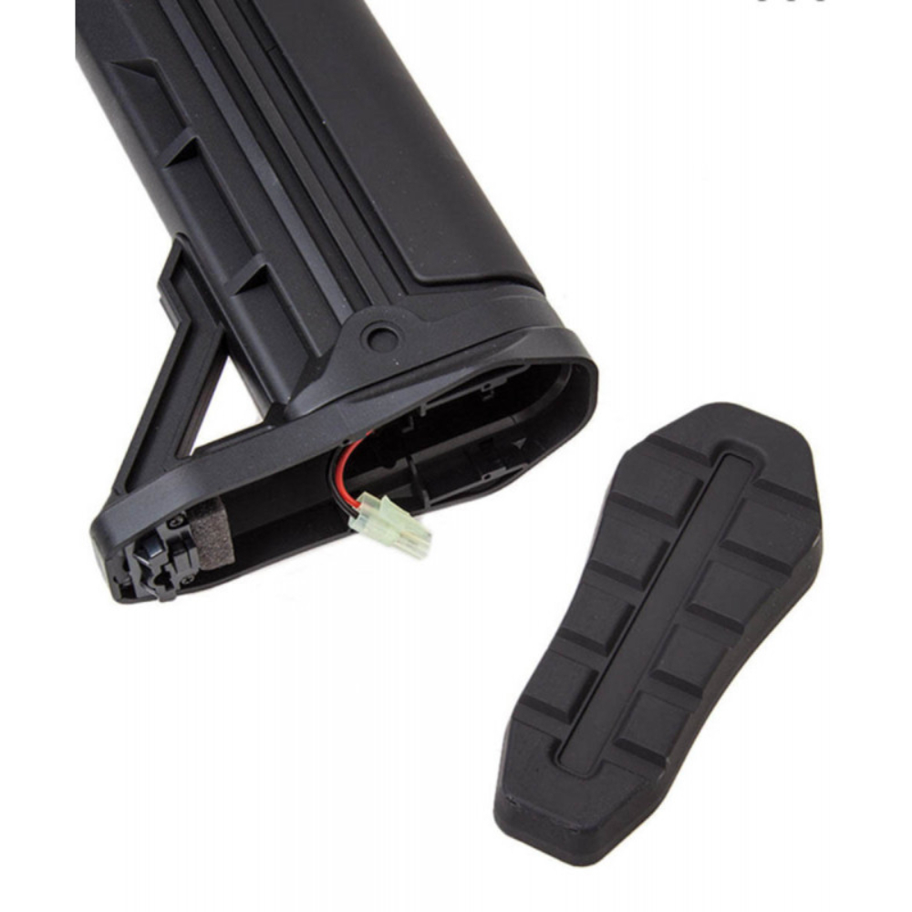 - Wired to the stock with a button latch hidden on the bottom of the butt pad.