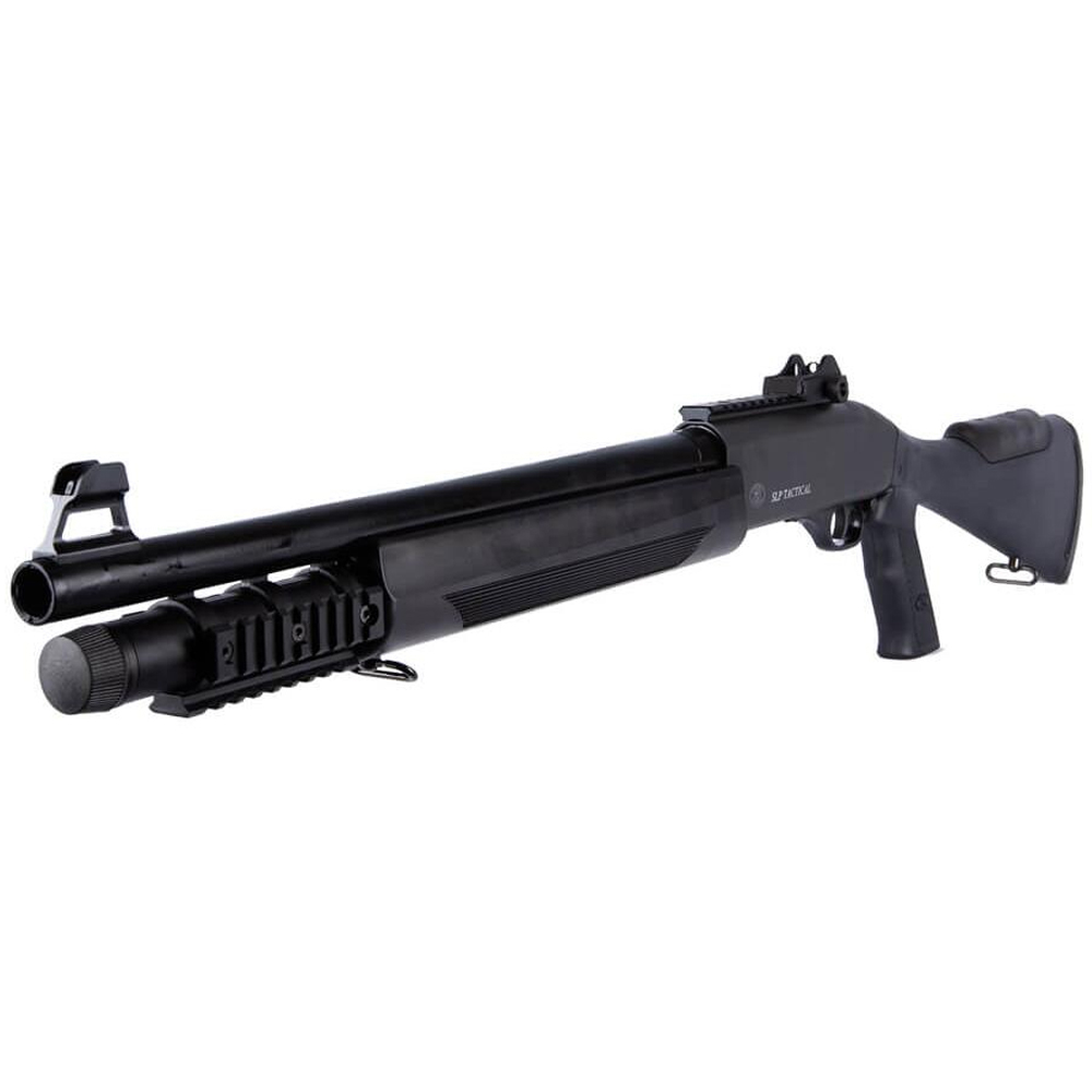 The Cybergun FN Herstal licensed SLP Tactical CO2-operated semi-automatic shotgun is not like any other shotgun on the Airsoft landscape. Being one of the only semi-auto format shotguns that utilizes the industry standard Marui style 30 round shotgun shells, the SLP also makes itself distinct by allowing the user to decide if they want to unleash 3 rounds at one, or one single round for targets at a farther distance.