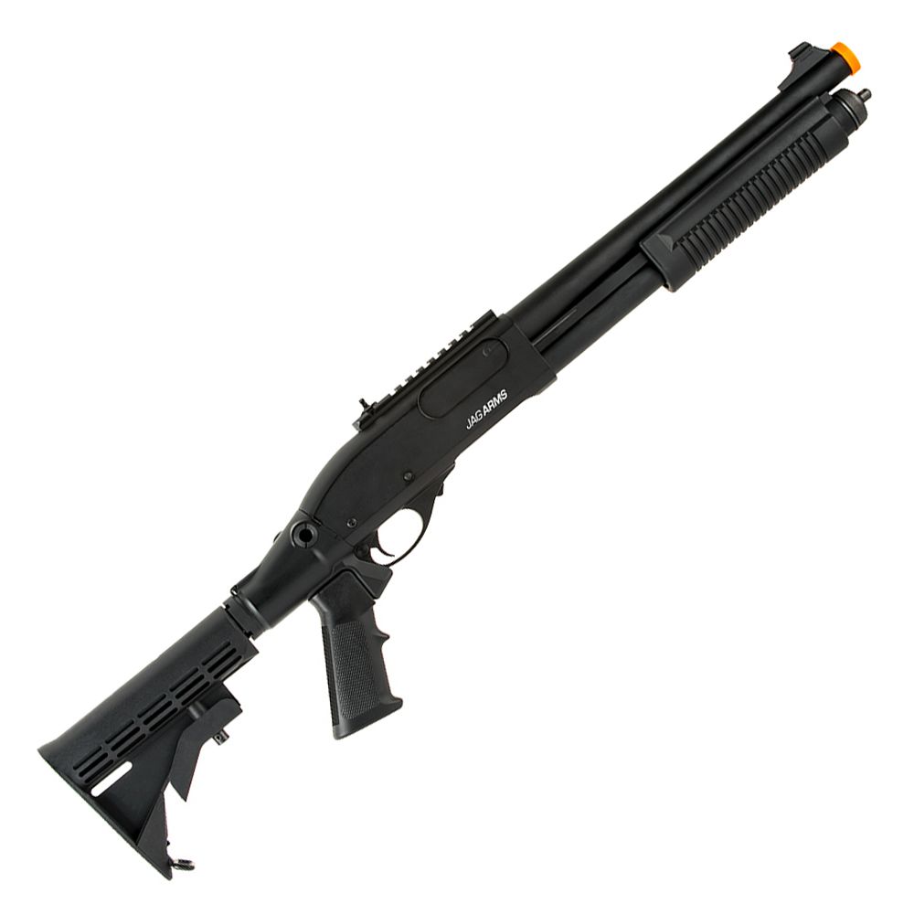 The wait for reliable and affordable gas shotgun is over; featuring JAG Arms Scattergun Gas Shotgun Series. TS Series features a M4 Style adapter with collapsable stock. The buffer tube also acts as the green gas reservoir which can approximately hold 110 shots per fill (shot per fill will vary on weather, shooting practice, and # of rounds per shot used). TS series also features a more traditional pistol grip; much like found on most common AR15/M4 rifles. This shotgun is constructed with a full metal receiver which also houses the standard m1913 Picatinny top rail to mount any optic. Under the metal barrel are 3 inner barrels with fixed hop up which allows the users to switch from 3 rounds or 6 rounds per shot by a flick of a lever located inside the ejection port.