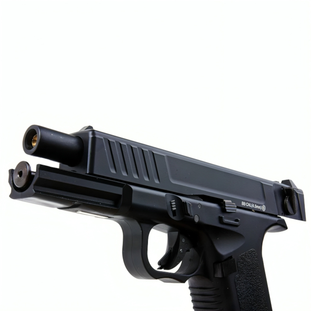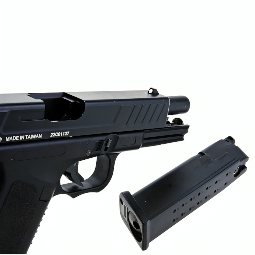 Build Quality: The KWC G18 features a durable metal slide paired with a polymer frame, offering a realistic weight while maintaining a lightweight and ergonomic design. The metal slide provides a true-to-life recoil experience, while the polymer frame ensures strength and reliability without making the pistol too heavy. The overall build feels solid, and the textured grip enhances control for more accurate shooting.
