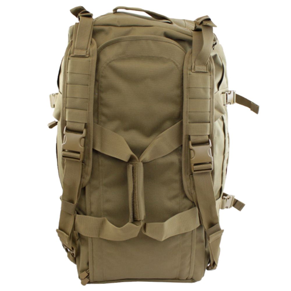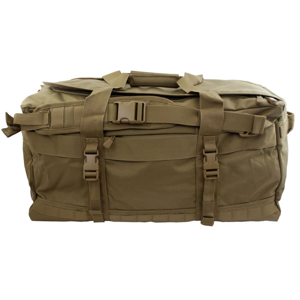Made from tear-resistant, water-resistant 1050D nylon, the 56L Tactical MOLLE Duffel Backpack is built for the tough stuff. A versatile tactical carry-all, the bag converts easily from a heavy-duty duffel bag to a backpack. The bag offers a roomy main compartment and a MOLLE platform for comprehensive customizable storage. Internal compression straps hold your gear right where you want it, and self-healing YKK zippers and Duraflex hardware ensure secure transport. The bag features grab handles and shoulder straps. Whether you're hauling armor or camping gear, this is the pack for you.