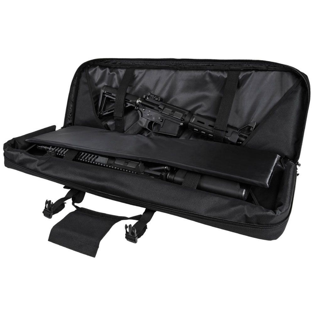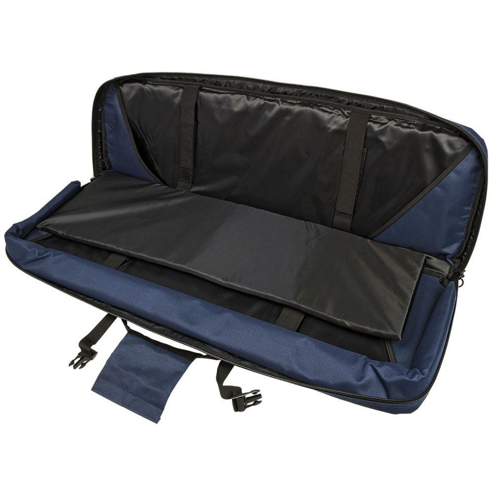The primary compartment will accommodate 2 rifles 35 inches in overall length with a thick padded center divider and 4 hook and loop straps to properly secure each rifle.