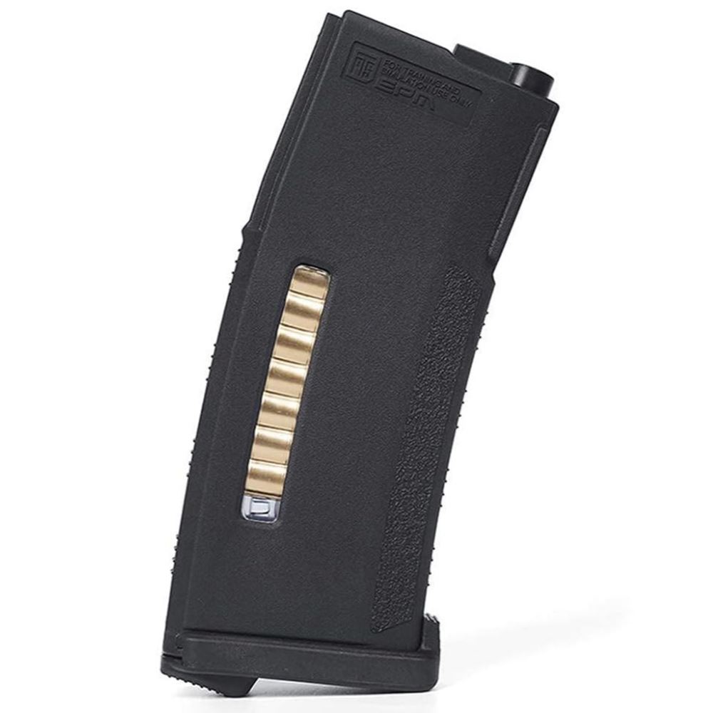 The EPM boasts a 150-round capacity, reinforced by a durable Dupont Zytel polymer shell for resilience in the field. A distinctive orange full load indicator ensures quick capacity checks, while the angled basepad enhances stability on flat surfaces and facilitates smooth extraction from pouches. The magazine's dot matrix pattern allows for customization, and continuous magazine well guides minimize snagging. With compatibility across various M4 AEGs, easy disassembly for maintenance, and parts replacement, the EPM offers a reliable and user-friendly experience.