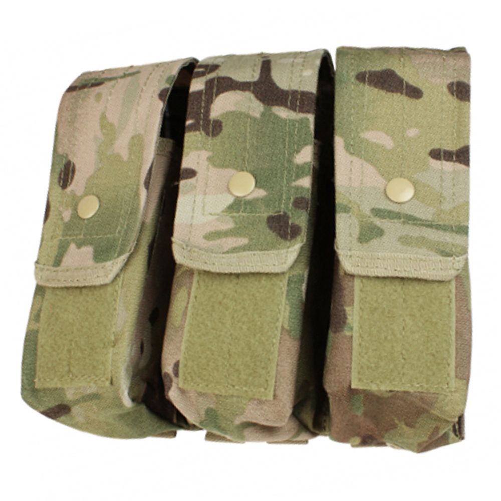 Comments: Keep your extra rifle magazines by your side with the Raven X Triple AR/AK Magazine Pouch. With adjustable pull tab covers, this pouch can fit up to six AR/AK magazines or up to nine M4/M16 magazines. The front flap is sealed with a hook and loop panel as well as snap buttons for extra security. PALS backstraps allow for easy attachment to MOLLE compatible gear.