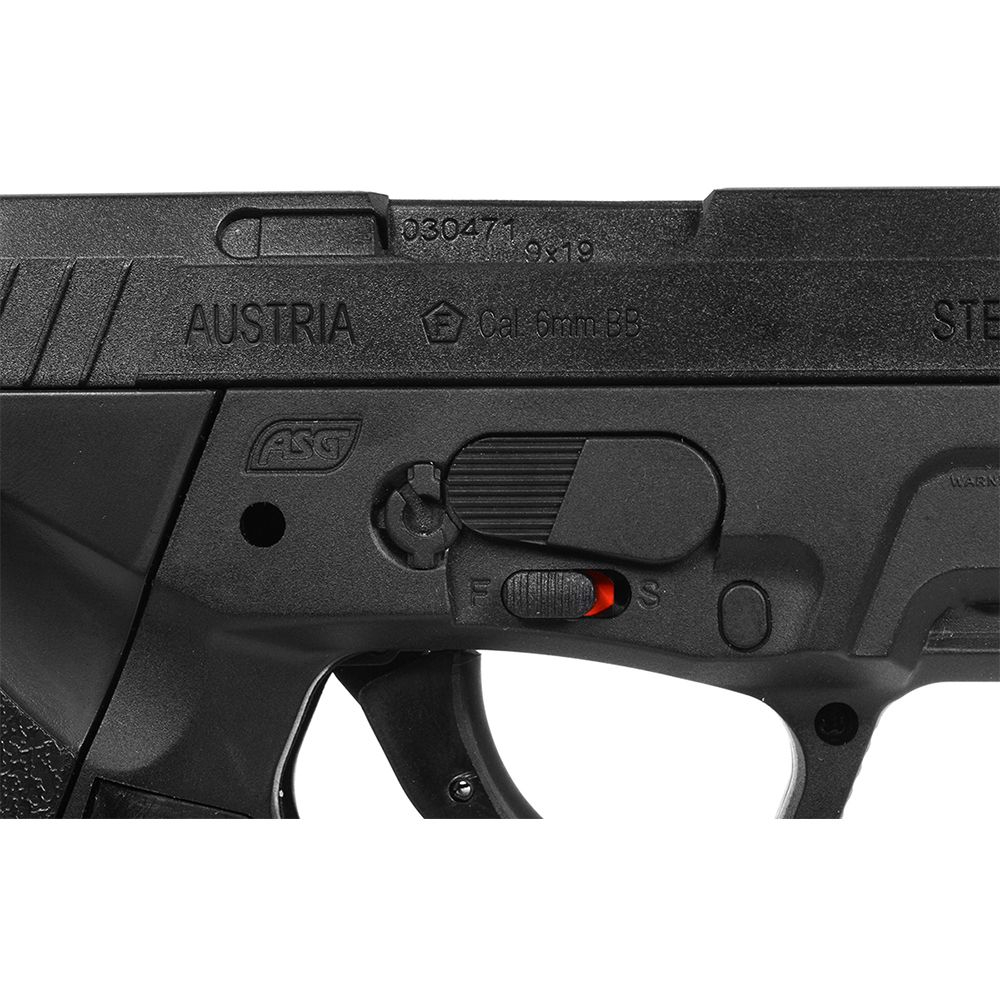 Realism: The ASG Steyr M9-A1 airsoft pistol is a really close replica to the actual 9mm ASG Steyr M9-A1 semi auto 9mm pistol, the only real giveaway is the safety. A "real looking" one is molded into the frame, but the actual usable safety (just below it) borrows from some other gun technologies and is a bit of a giveaway. Other than that the ASG Steyr M9-A1 with its Steyr licensing and trademarks looks pretty much bang on to the original pistol.