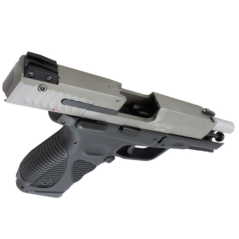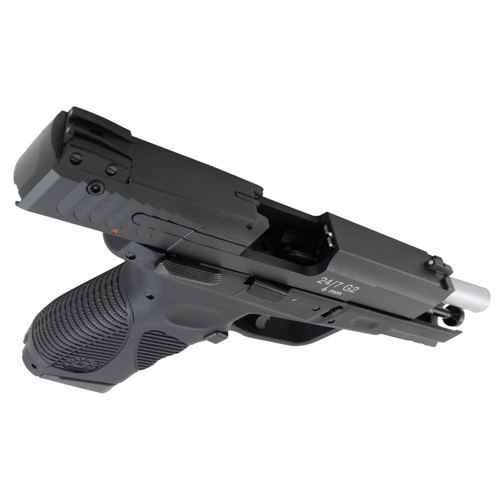 Comments: The Taurus PT24/7 G2 was originally designed as a concealed carry sidearm for police. This authentic airsoft replica is a great backup piece to storm the battlefield with. It features a 1:1 scale design with all the real gun's features, including a polymer frame, heavily textured ergonomic grip, 20mm accessory rail, and a trigger safety to prevent misfires.